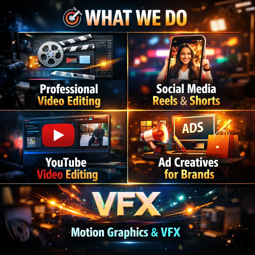 We are a creative video editing agency focused on helping brands, creators, and businesses turn their raw footage into high-quality, engaging, and cinematic content that stands out across platforms like YouTube, Instagram, and Ads.